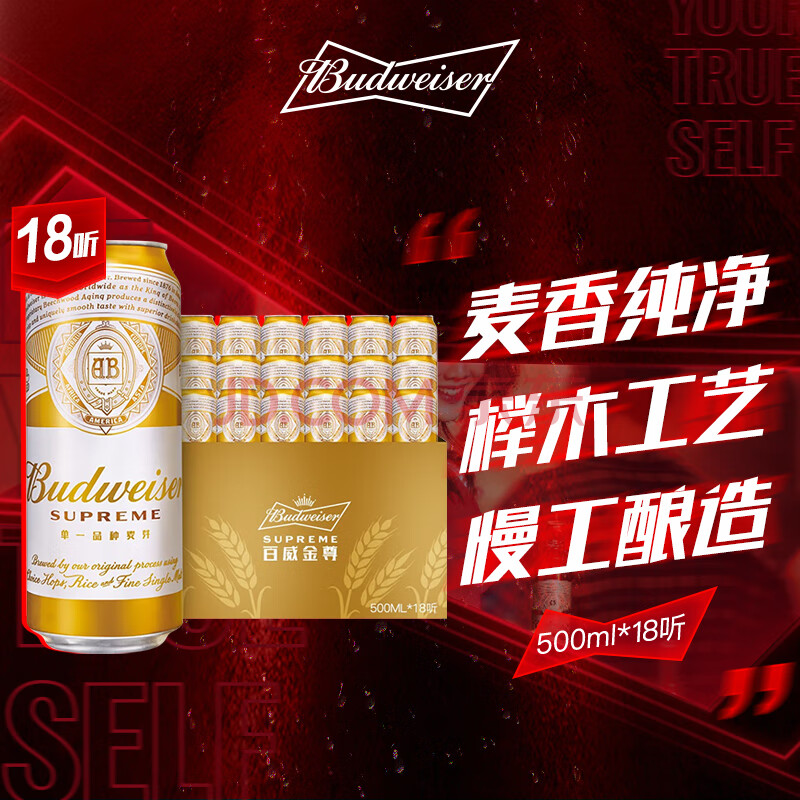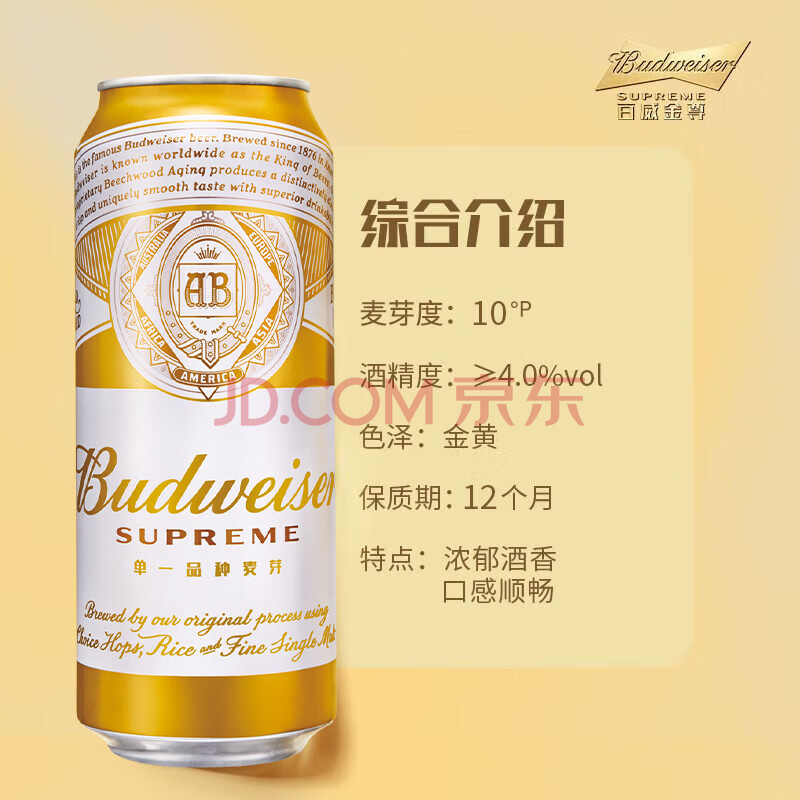 商品相册:百威金尊啤酒500ml*18听整箱装 单一麦芽原麦京东自营喜酒踏春送礼第
