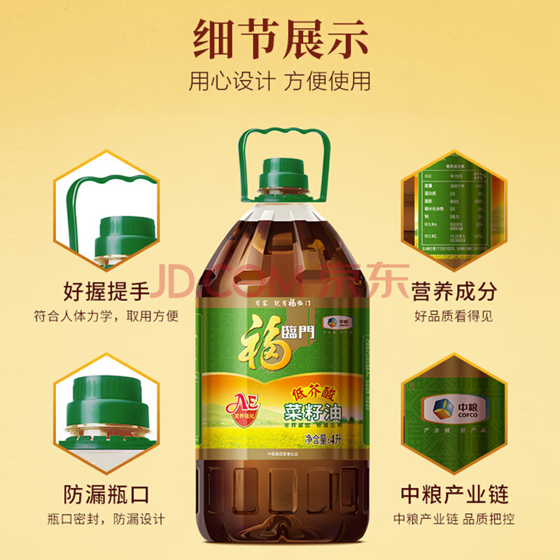 商品相册:福临门食用油 低芥酸非转基因菜籽油4L 添加维生素A/E 中粮出品第