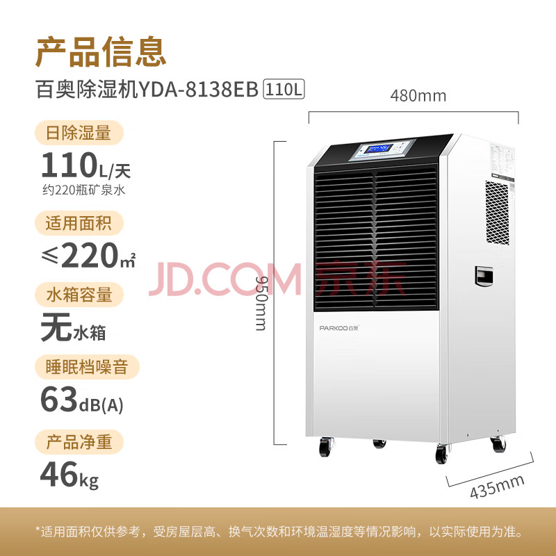 商品相册:百奥(PARKOO)除湿机工业/抽湿机工业 110升大功率仓库地下室别墅除湿器 150-350平方工业除湿机 YDA-8138EB第1张/共6