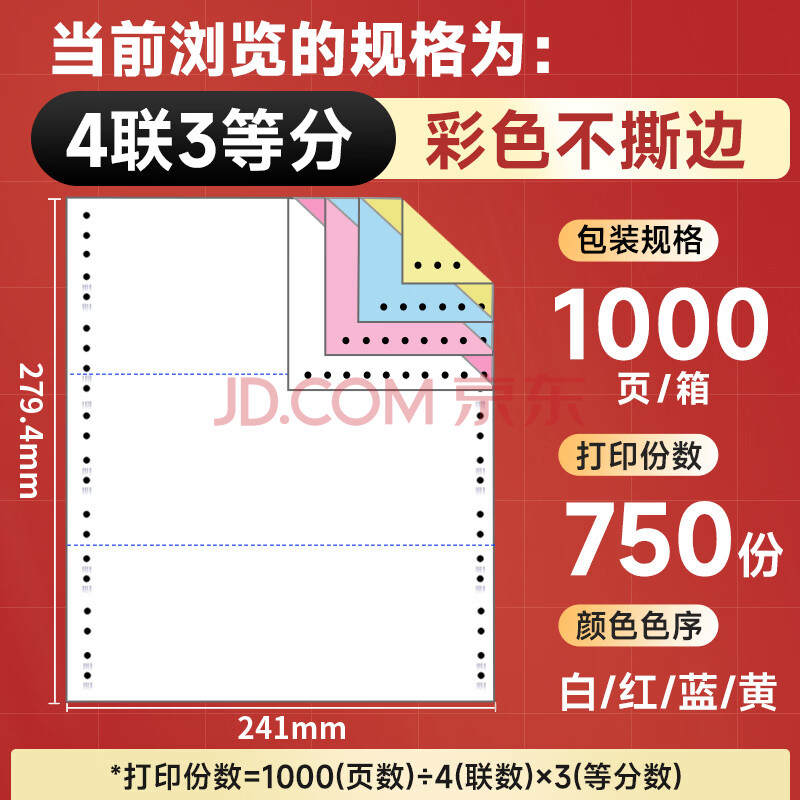 商品相册:天章 (TANGO)【缺页十倍赔】天章风四联三等分不撕边 针式电脑打印纸 出入库送货单1000页 241-4-1/3(白红蓝黄)第