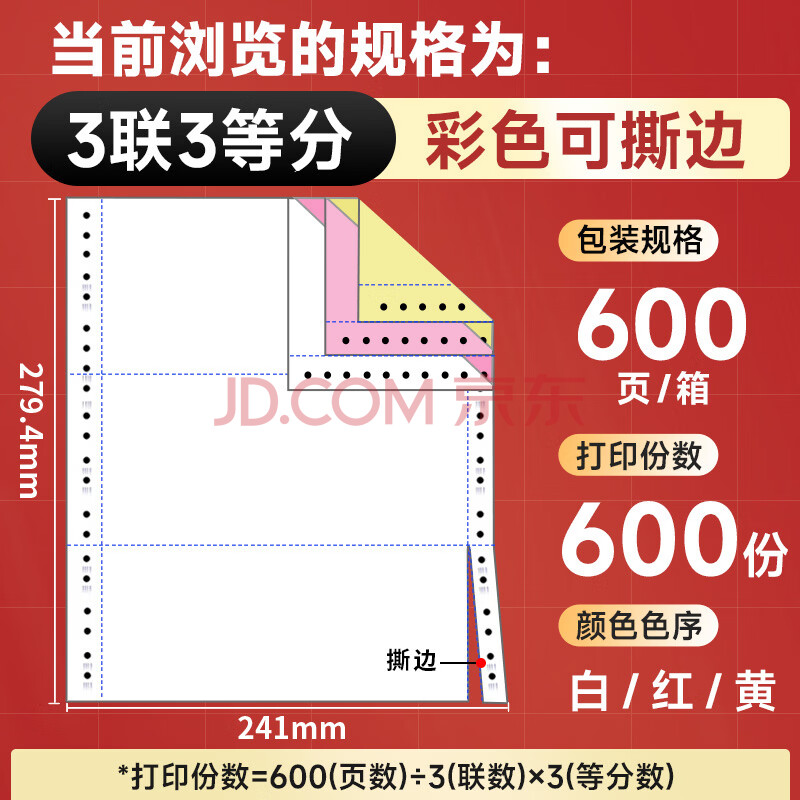 商品相册:天章 (TANGO)【缺页十倍赔】天章风三联三等分可撕边 针式电脑打印纸 出入库送货清单600页 241-3-1/3S(白红黄)第