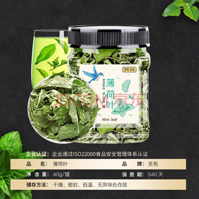 商品相册:贡苑薄荷叶茶 清凉新鲜干薄荷可食用搭玫瑰柠檬调酒泡水喝花草茶叶40g第1张/共8