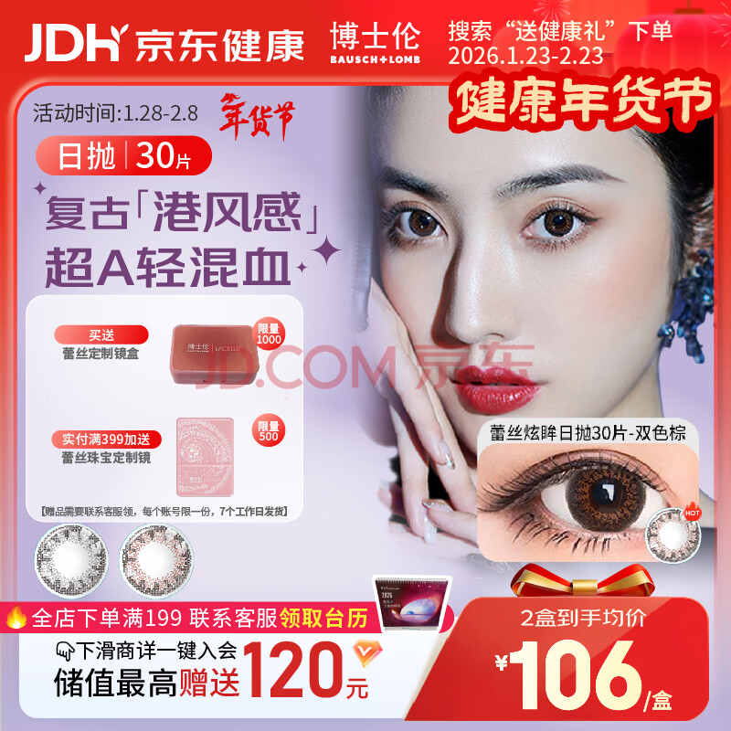 商品相册:博士伦美瞳 彩色隐形近视眼镜日抛小直径蕾丝炫眸30片双色棕0度第1张/共9