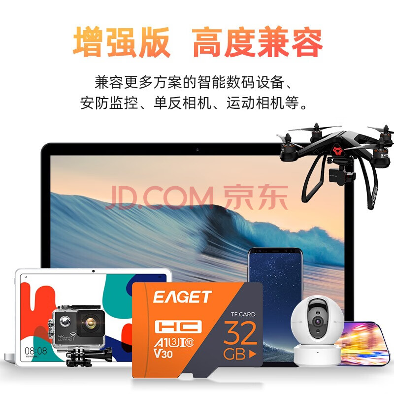 商品相册:忆捷(EAGET)32GB TF(MicroSD)存储卡 A1 U3 V30 C10增强版 高速耐用视频监控摄像专用内存卡 读速100MB/s第