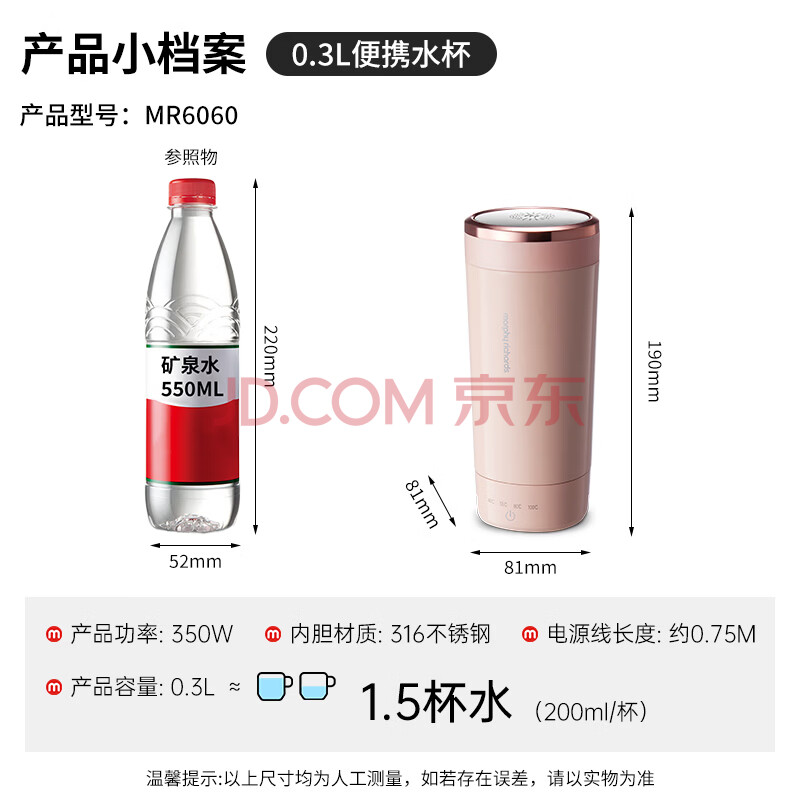 商品相册:摩飞电器(Morphyrichards)电热水杯电热水壶 家用旅行便携式烧水壶烧水杯 0.3L随行冲奶泡茶办公养生保温杯电热杯MR6060粉第