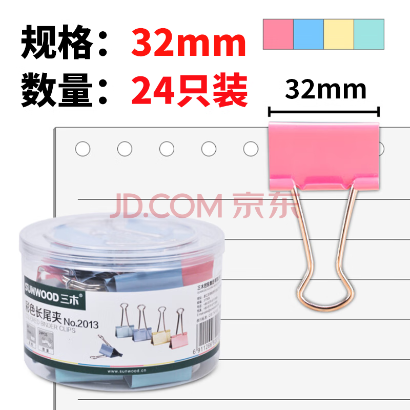商品相册:三木(SUNWOOD)32mm彩色长尾夹/金属燕尾夹/票据夹/长尾票夹 办公用品 24只/筒 2013第