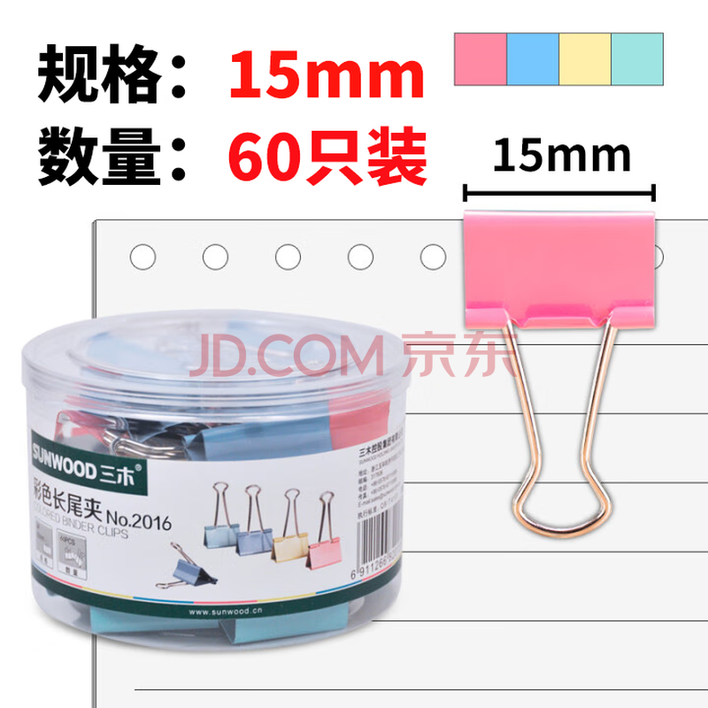 商品相册:三木(SUNWOOD)15mm彩色长尾夹/金属燕尾夹/票据夹/长尾票夹 办公用品 60只/筒 2016第