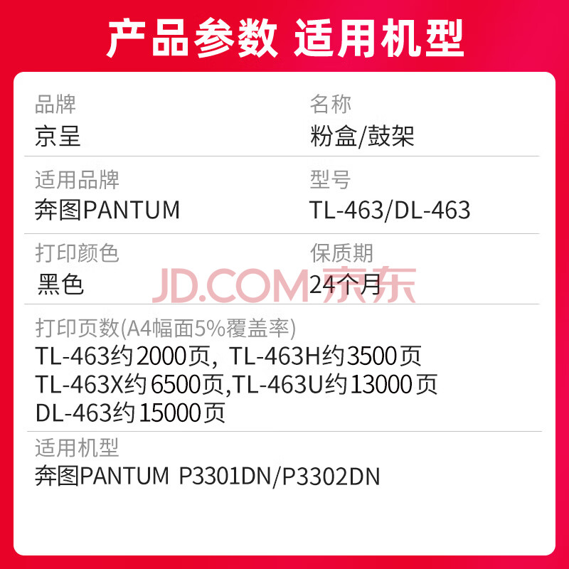 商品相册:京呈 适用奔图P3301DN硒鼓TL-463粉盒PANTUM打印机墨盒DL-463硒鼓架碳粉墨粉鼓组件第