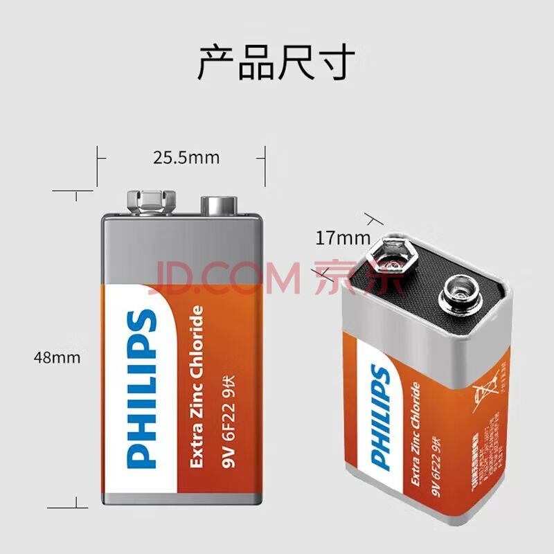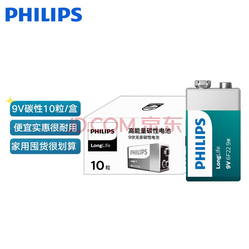 商品相册:飞利浦(PHILIPS)碳性9V电池10粒/盒方块电池适用万能表/无线麦克风/电子仪表/报警器等商超同款电池6F22第