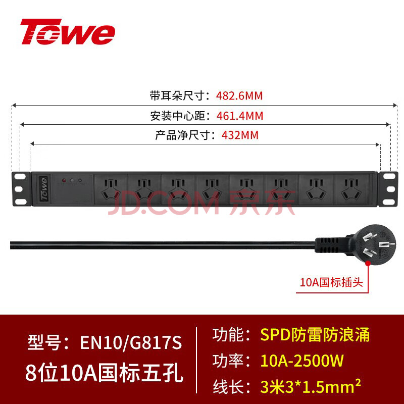 商品相册:TOWE同为防雷防浪涌抗电涌PDU机柜插座插排8位10A国标五孔插排插线板EN10/G817S第