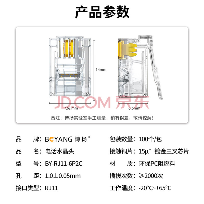 商品相册:博扬(BOYANG)电话水晶头三叉式 2芯语音电话线接头 RJ11语音电话线水晶头(15U镀金)100/盒 BY-RJ11-6P2C第