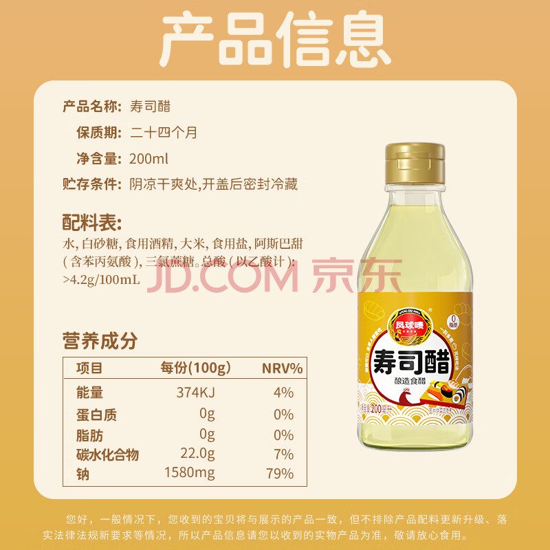 商品相册:凤球唛寿司醋200ml 日式料理寿司食材饭团手卷包饭调味0脂肪米醋汁第