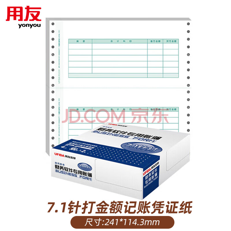 商品相册:用友(UFIDA) 7.1针打金额记账凭证纸 241*114.3mm 2000份/箱 用友软件T3/T6/U8/好会计凭证打印纸 10061第