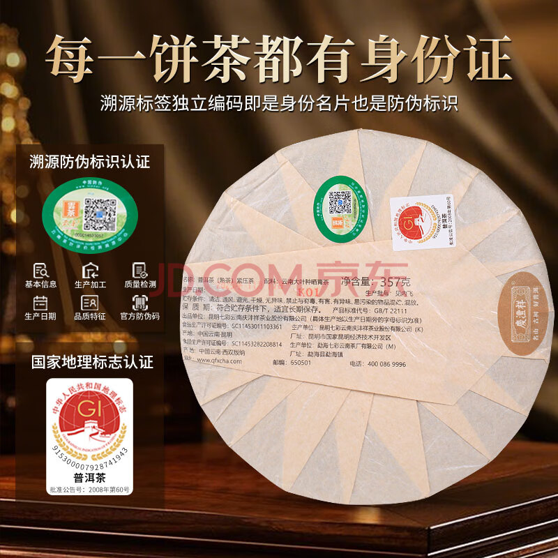 商品相册:七彩雲南庆沣祥普洱茶 2018年君悦普洱熟茶饼七子饼茶357g 送礼茶叶礼盒第