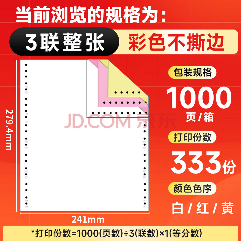 商品相册:天章 (TANGO)【缺页十倍赔】天章龙 三联整张针式打印纸 不撕边打印纸 出入库送货清单1000页 241-3(白红黄)第