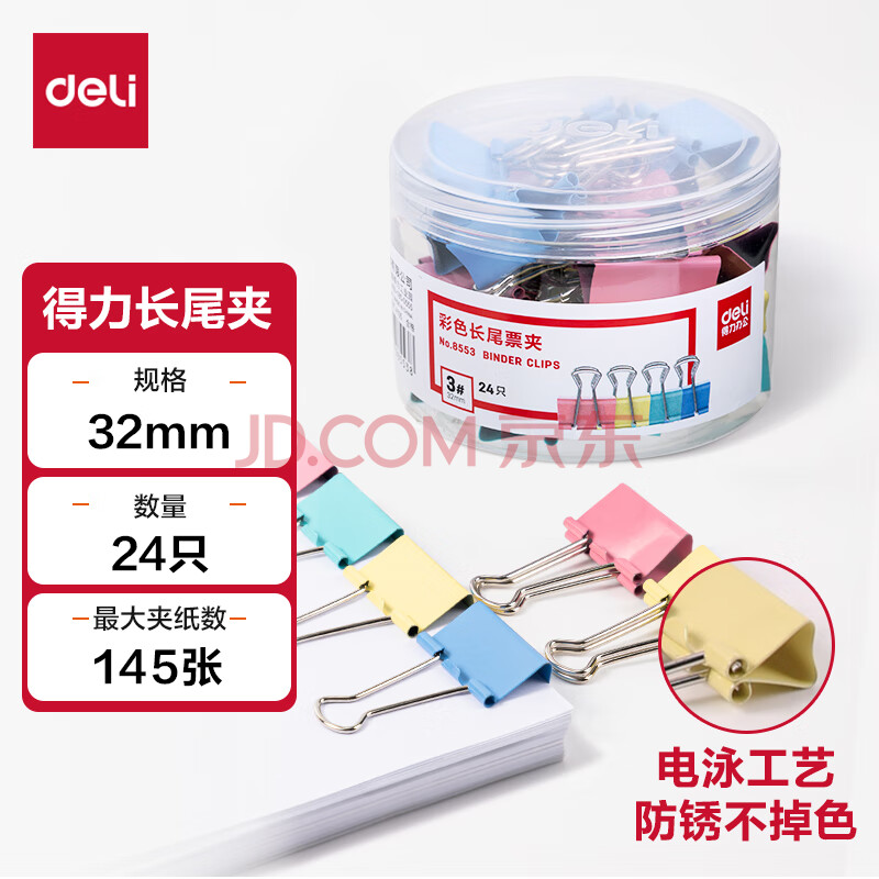 商品相册:得力(deli)24只32mm彩色长尾夹票夹 3#中号金属燕尾夹票据文件夹子 办公用品 24只/筒 8553第