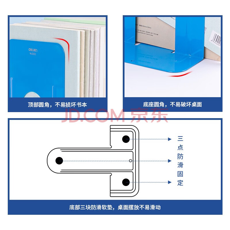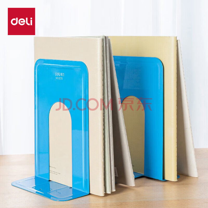 商品相册:得力(deli)8.5英寸(高21cm)金属铁桌面书立置物架书收纳桌上书架 书籍挡靠架2片/ 办公学习用品 蓝色第