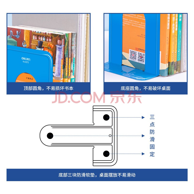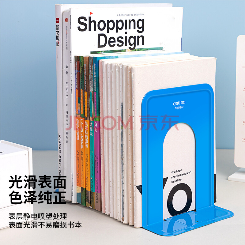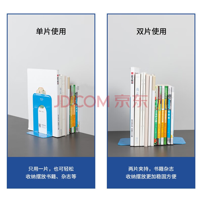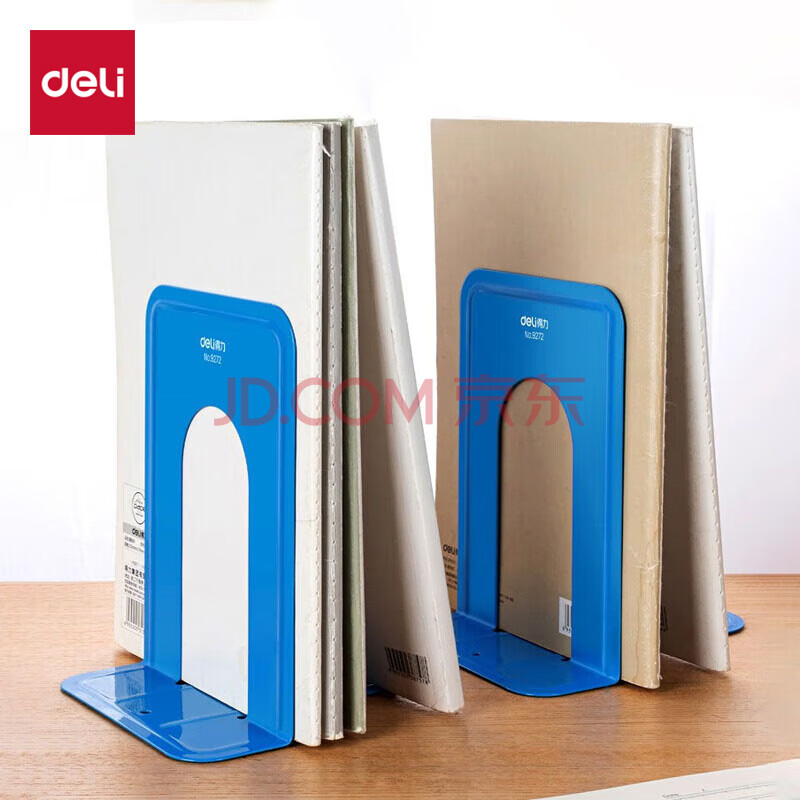 商品相册:得力(deli)7英寸(高17cm)金属铁桌面书立置物架书收纳桌上书架 办公书靠2片/ 办公学习用品 蓝色第