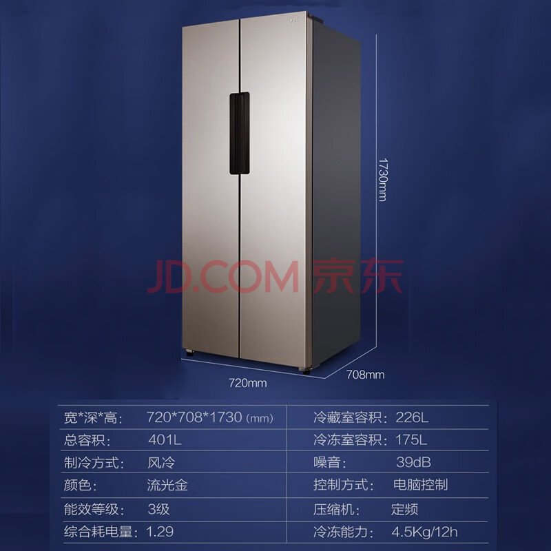 商品相册:TCL BCD-401W 401升 对开门家用电冰箱 三级能效 流光金第