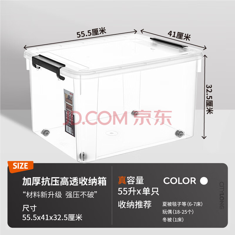 商品相册:禧天龙塑料衣物收纳箱玩具整理箱车载储物箱55L 透明 1个装 带轮第1张/共4