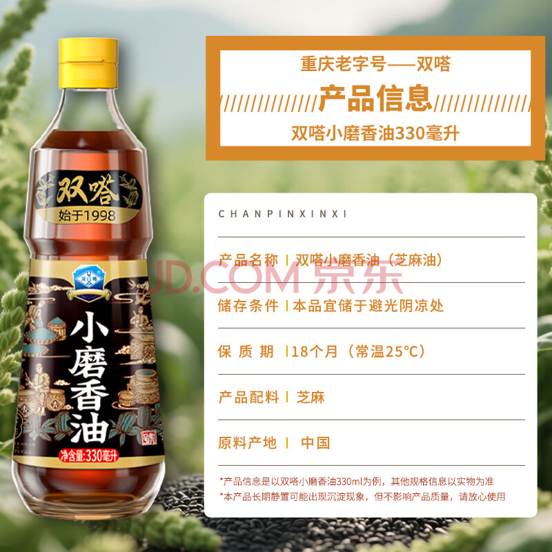 商品相册:双嗒小磨香油 纯香芝麻油 芝麻香油 重庆老字号 330ml 玻璃瓶装第