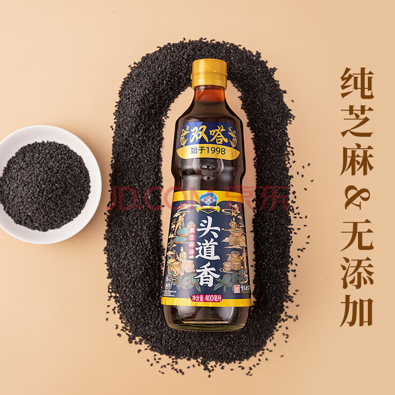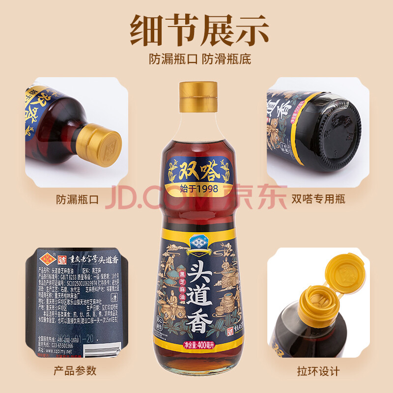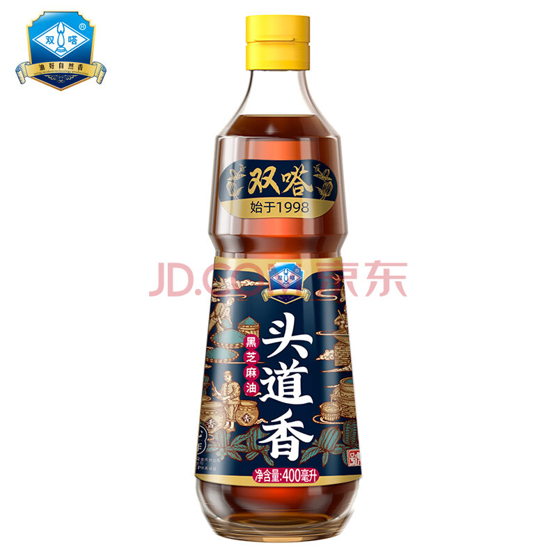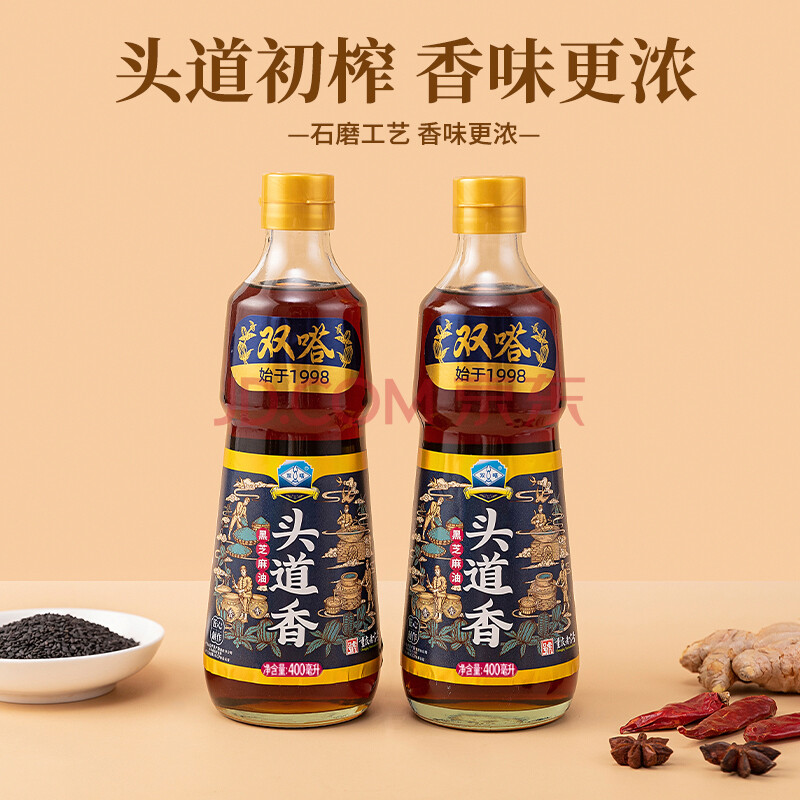 商品相册:双嗒 头道香芝麻油香油 黑芝麻油 重庆老字号 400ml 玻璃瓶装第