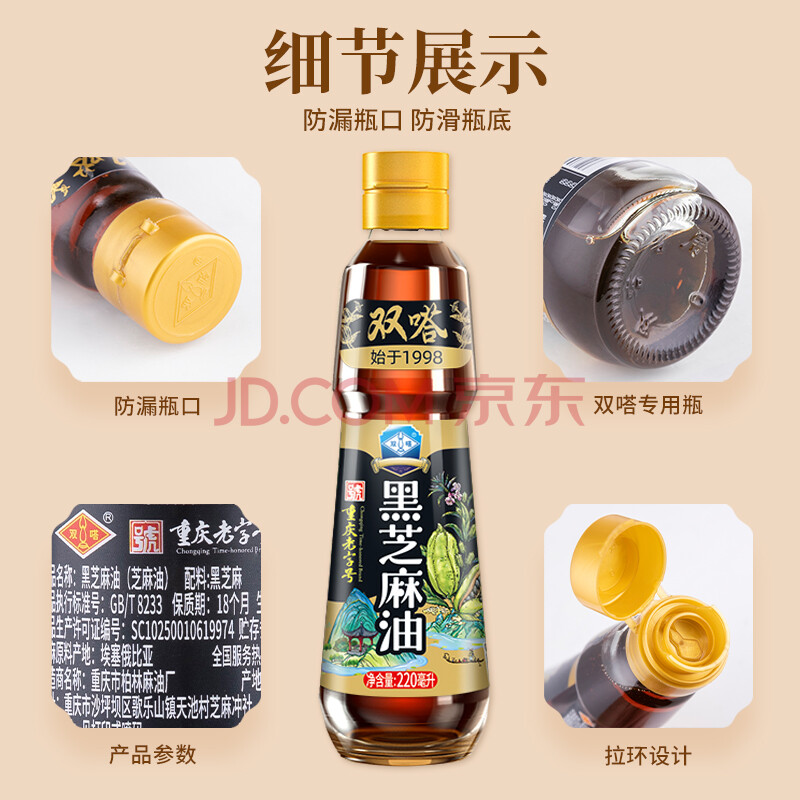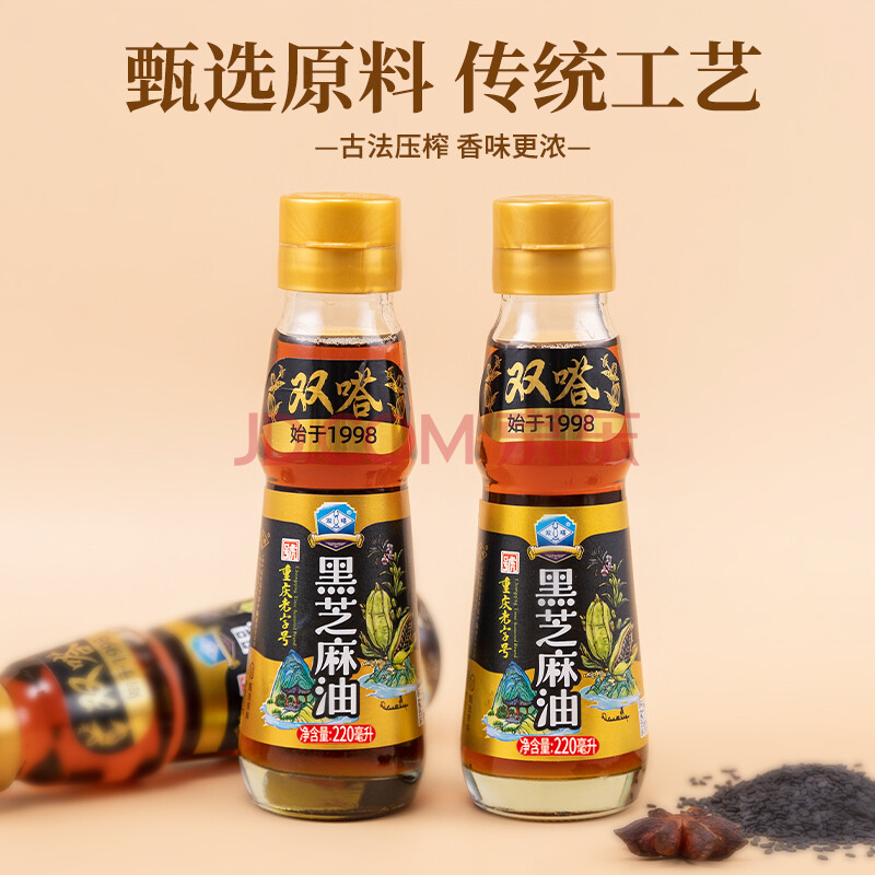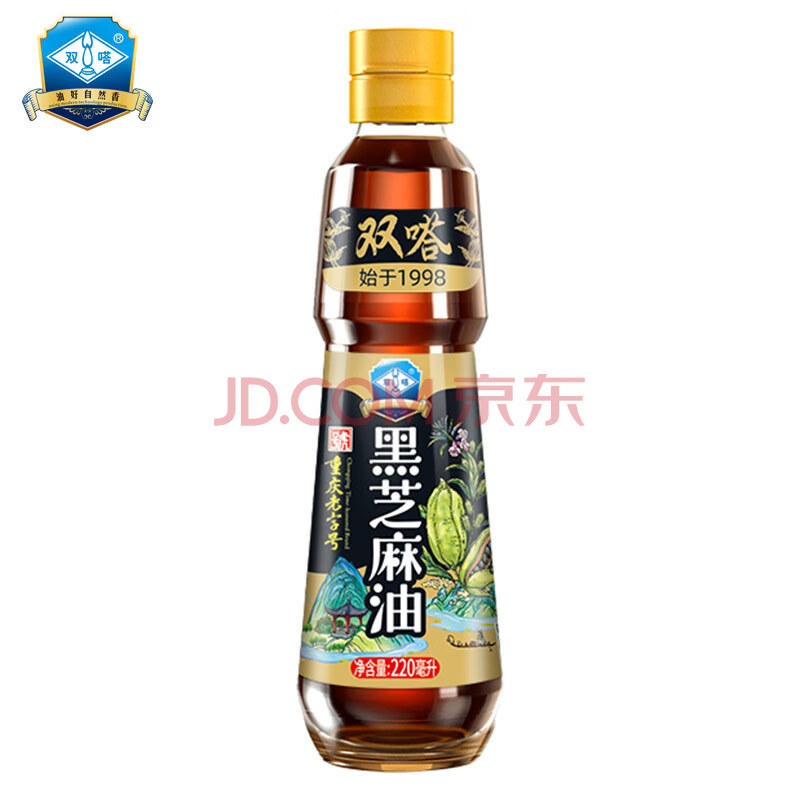 商品相册:双嗒黑芝麻油香油 纯黑芝麻油 重庆老字号 220ml 玻璃瓶装第