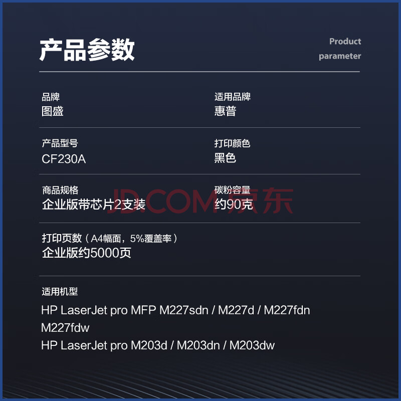 商品相册:图盛CF230A粉盒适用惠普M227fdw硒鼓HP M203dn 203d 203dw M227d 227sdn 227fdn打印机墨盒粉盒30a硒鼓CF230X第
