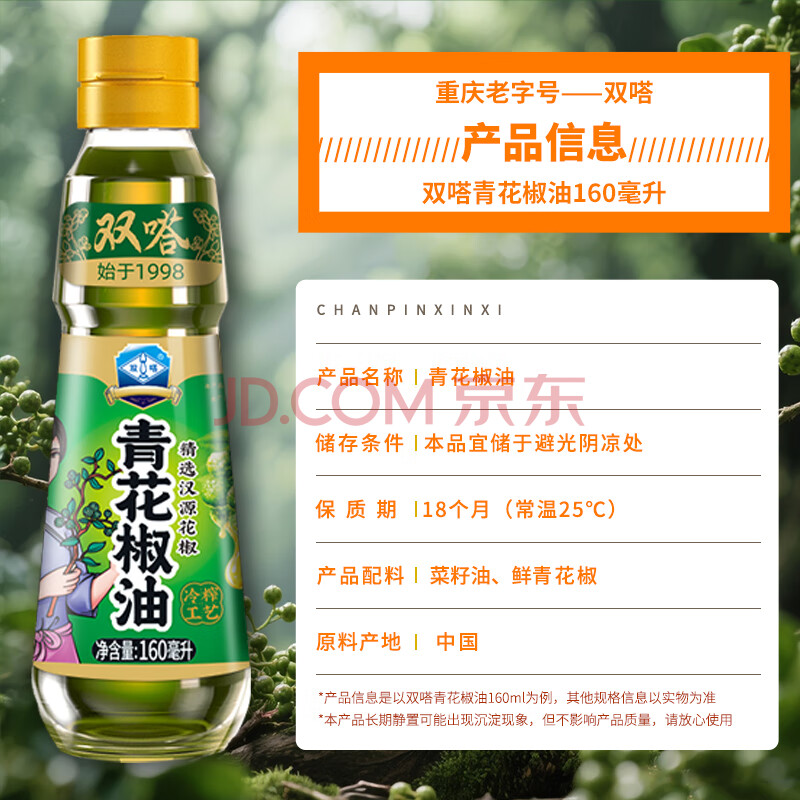 商品相册:双嗒青花椒油 鲜花椒油 藤椒油麻辣烫 重庆老字号 160ml 玻璃瓶装第