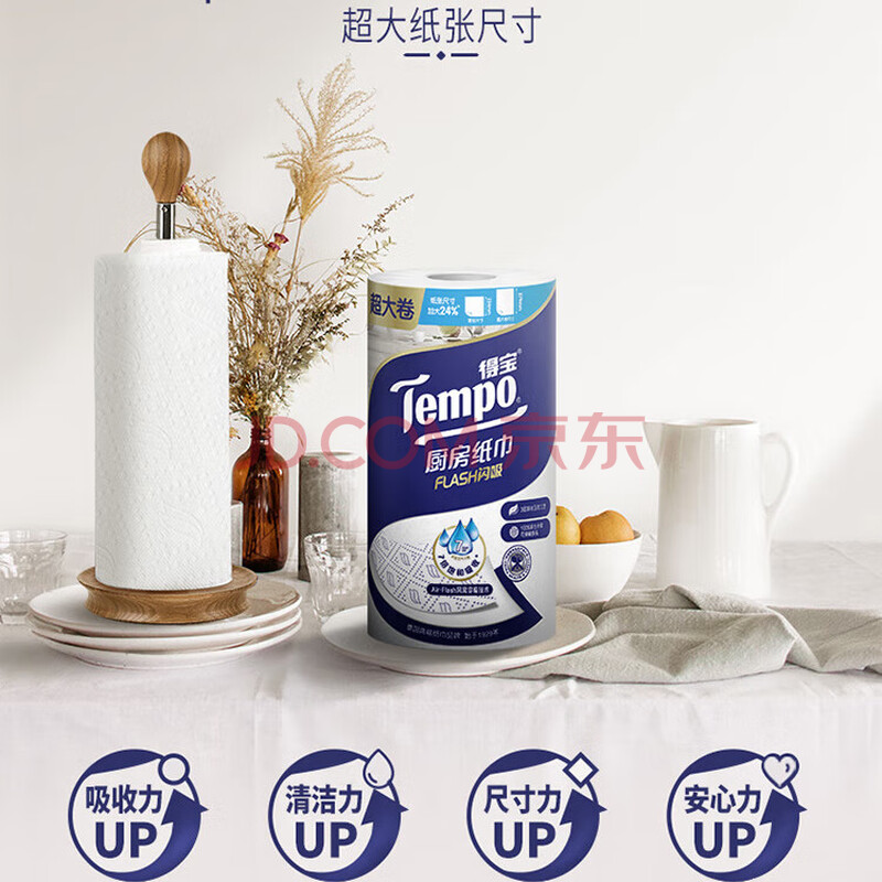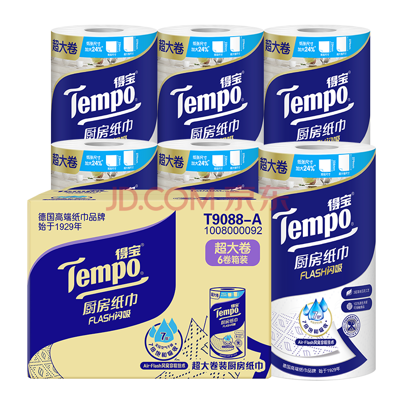 商品相册:得宝(TEMPO)一博同款 厨房卷纸88节*6卷 水油瞬吸 超大尺寸 吸油纸 懒人抹布第