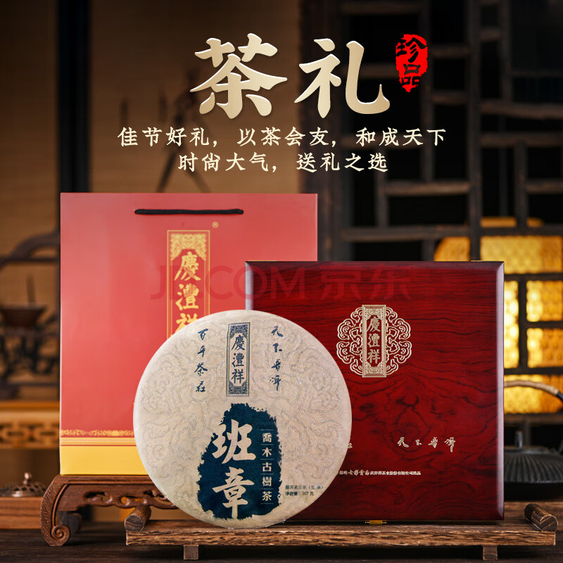 商品相册:七彩雲南普洱茶 2019年班章百年古树茶 特级普洱生茶饼357g 送礼茶叶礼盒第1张/共9