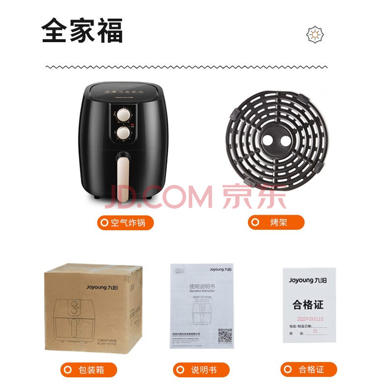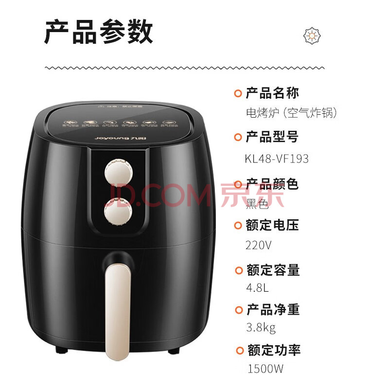 商品相册:九阳(Joyoung)空气炸锅 家用智能4.8升大容量 不粘易清洗 准确定时无油薯条机 KL48-VF193第