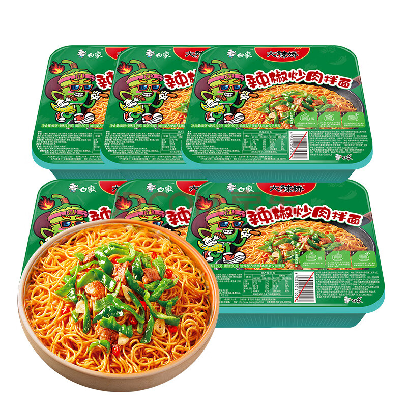 商品相册:白象 方便面 拌面 大辣椒拌乐多辣椒炒肉拌面114g*6盒装第
