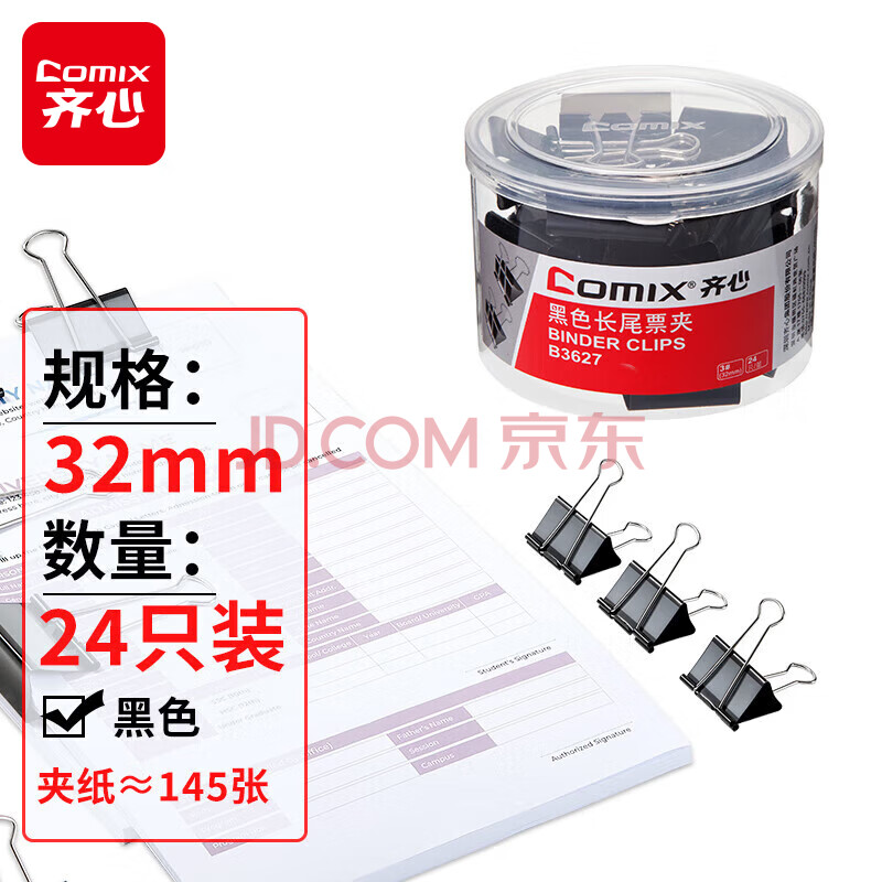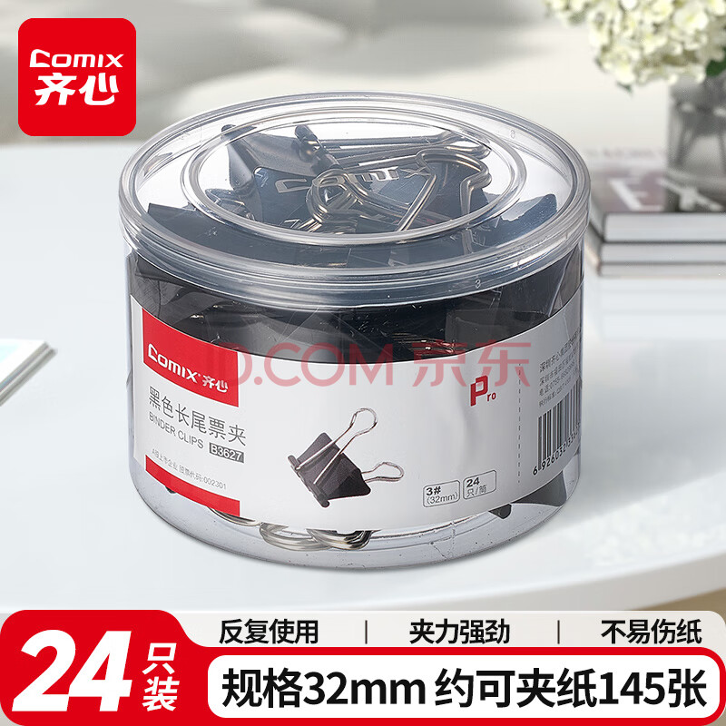 商品相册:齐心(COMIX)(Comix)长尾夹/燕尾夹/票夹 黑色金属夹子 3#32mm 24只/筒 办公用品工具B3627第