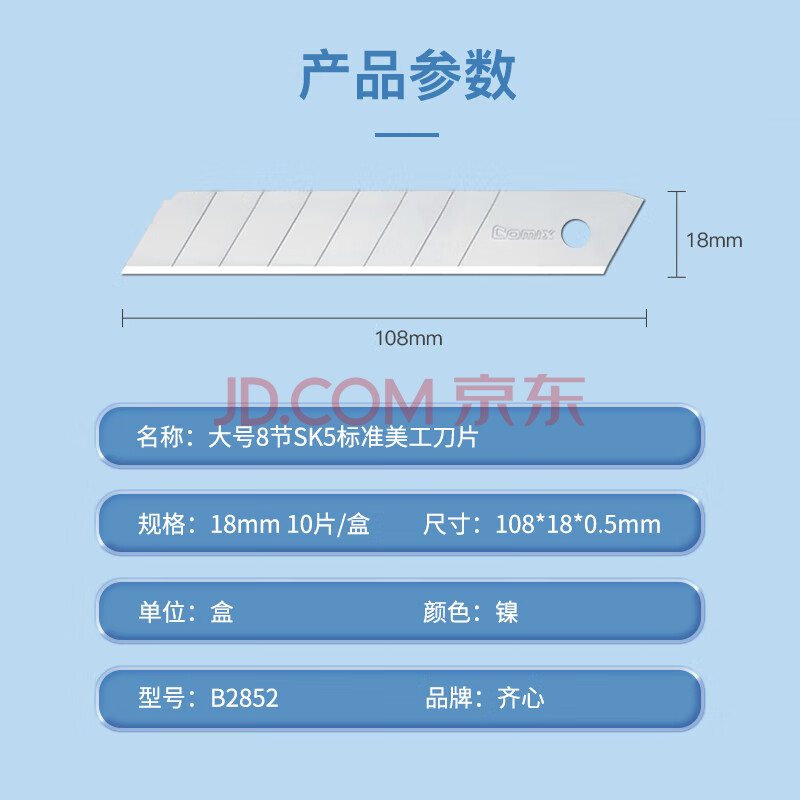 商品相册:齐心美工刀片 18mmSK5精钢壁纸刀片 10片装 办公用品 工具 B2852第