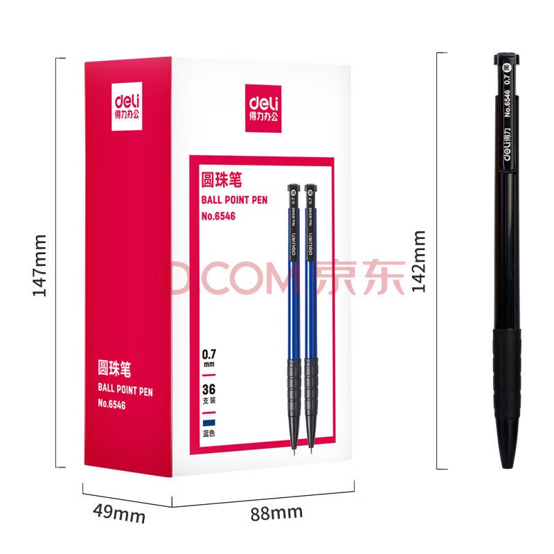 商品相册:得力(deli)圆珠笔中油笔 0.7mm子弹头软胶握手原子笔按动笔 办公用品 蓝色 36支/盒 P06546第
