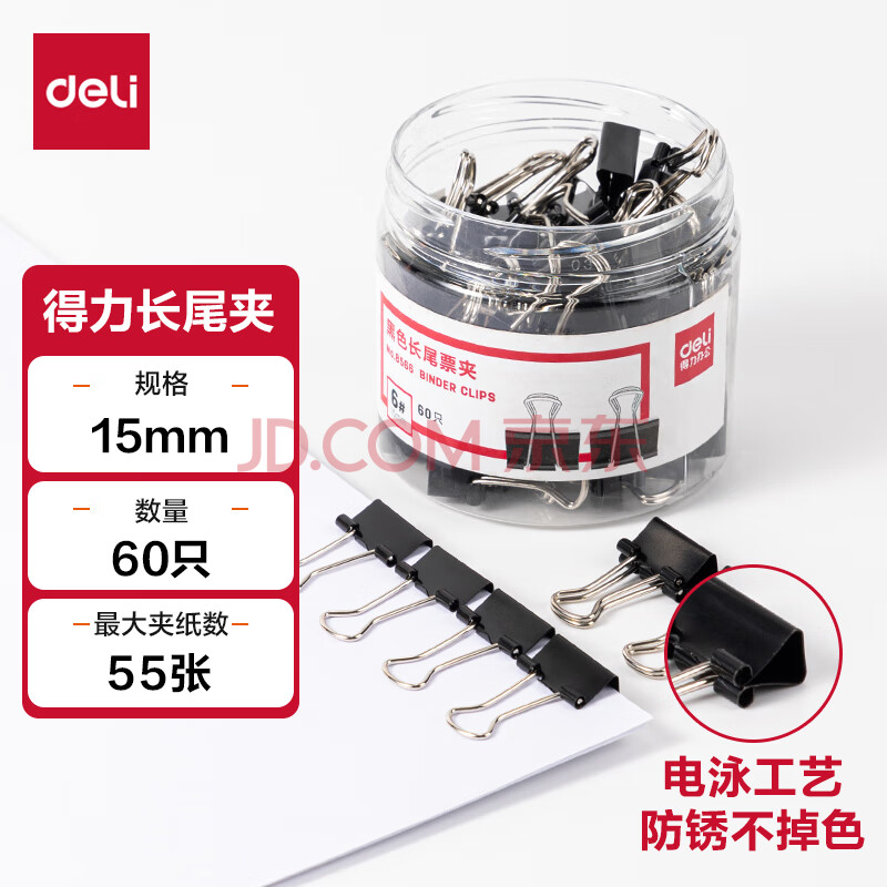 商品相册:得力(deli)【超级爆款】60只15mm黑色长尾夹票夹 小号金属燕尾夹票据文件夹办公 60只/筒 8566第