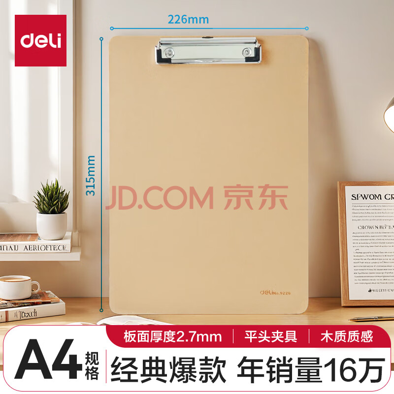 商品相册:得力(deli)A4木质感金属便携强力夹书写板夹/写字垫板试卷资料收纳夹 棕色9226 办公用品第1张/共6