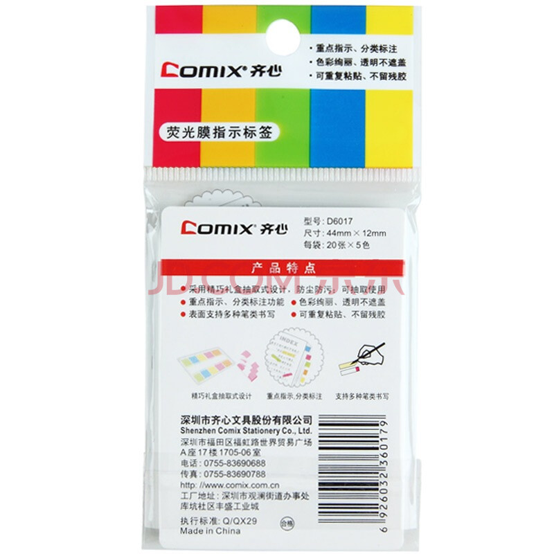 商品相册:齐心(COMIX)【全网低价】荧光膜索引标签指示贴/荧光贴/便签纸/便利贴(44x12mm)20张*5色开学文具拼单 D6017第