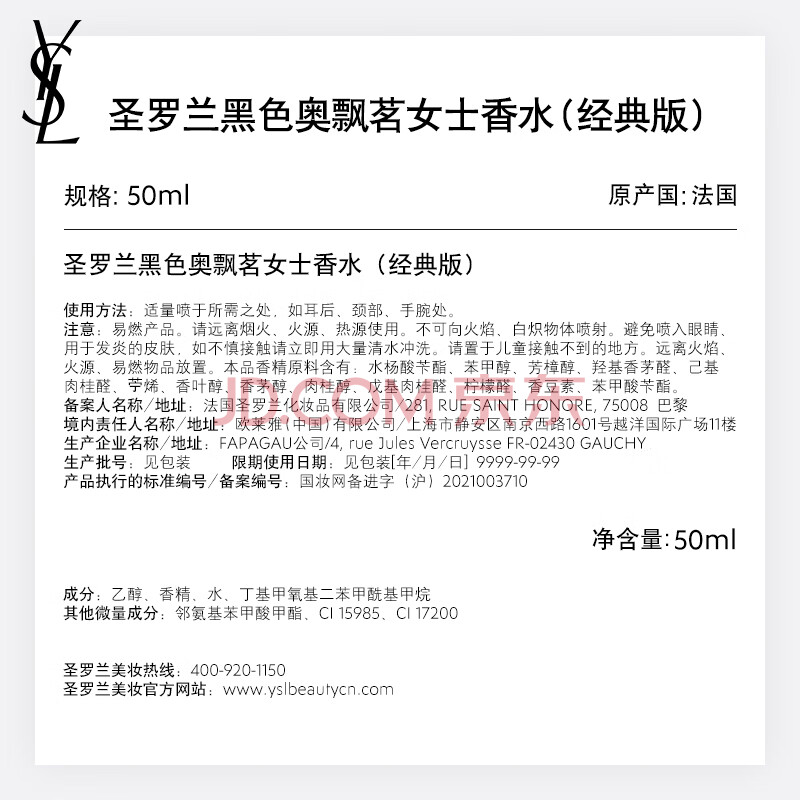 商品相册:YSL圣罗兰黑色奥飘茗黑鸦片女士香水50ml化妆品生日礼物送女友第