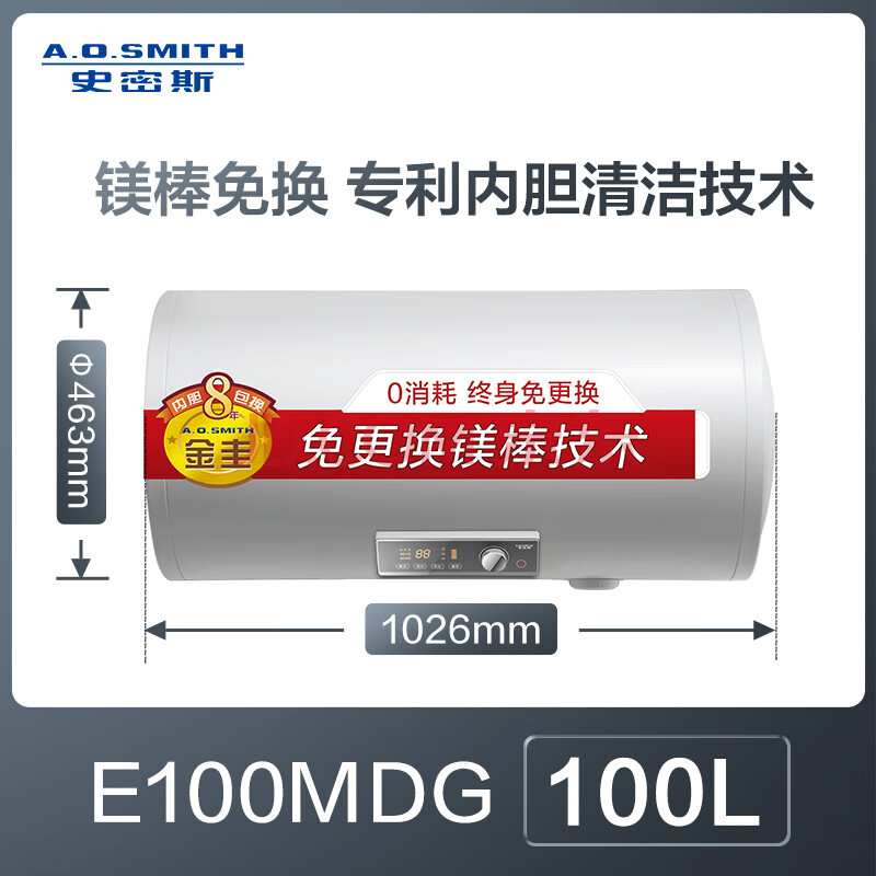 商品相册:史密斯(A.O.SMITH)金圭电热水器100升MDG 大水量 免换镁棒 专利内胆清洁技术 双棒速热 第