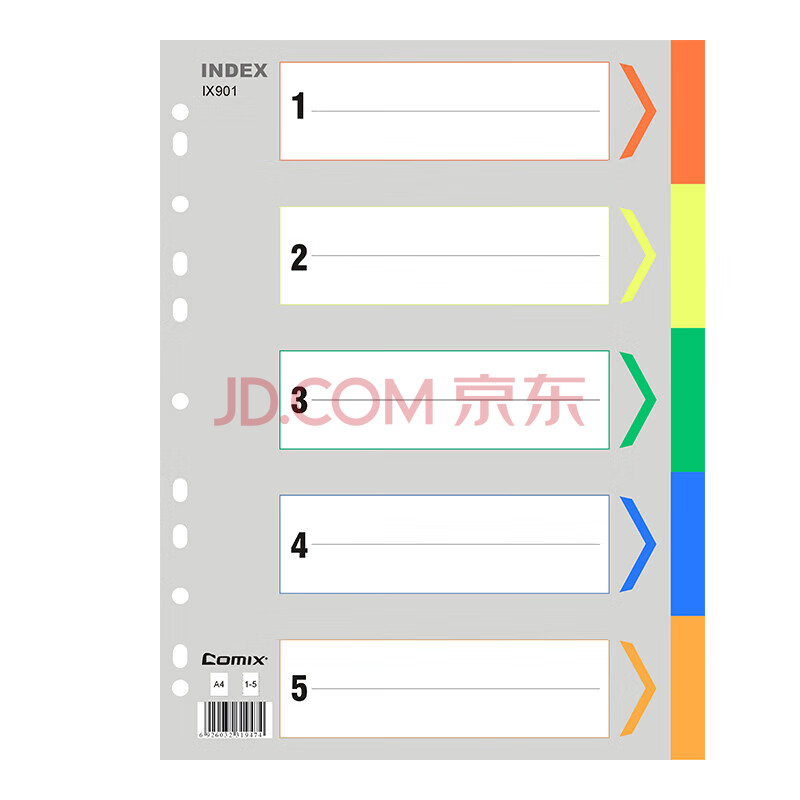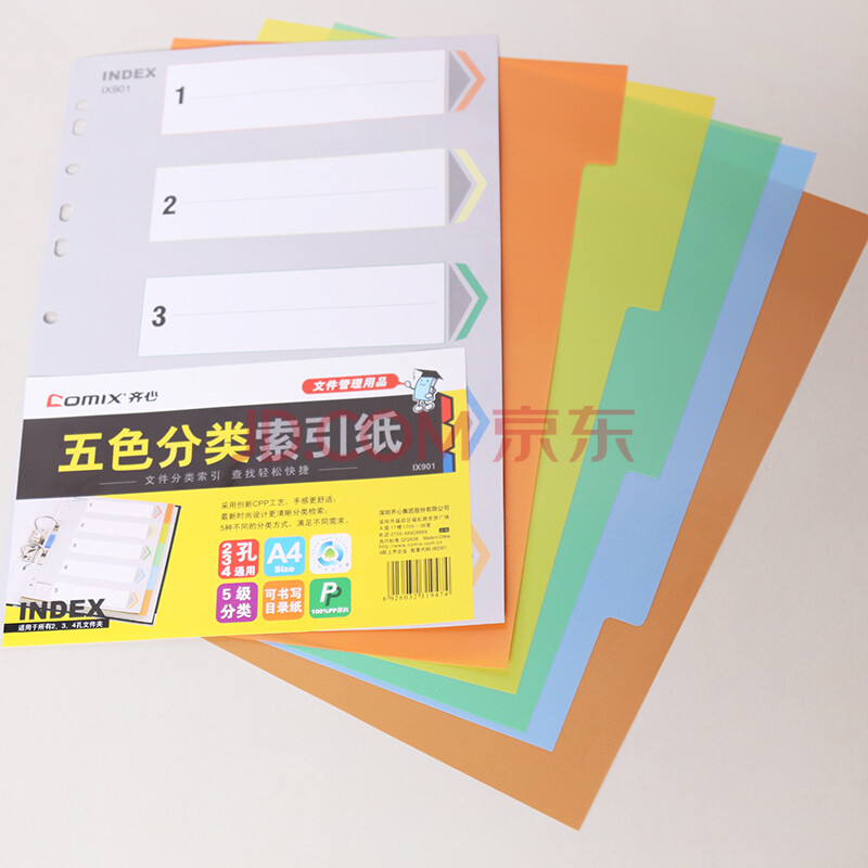 商品相册:齐心(Comix)IX901 11孔A4五色隔页索引纸5页/包(单位:包)第