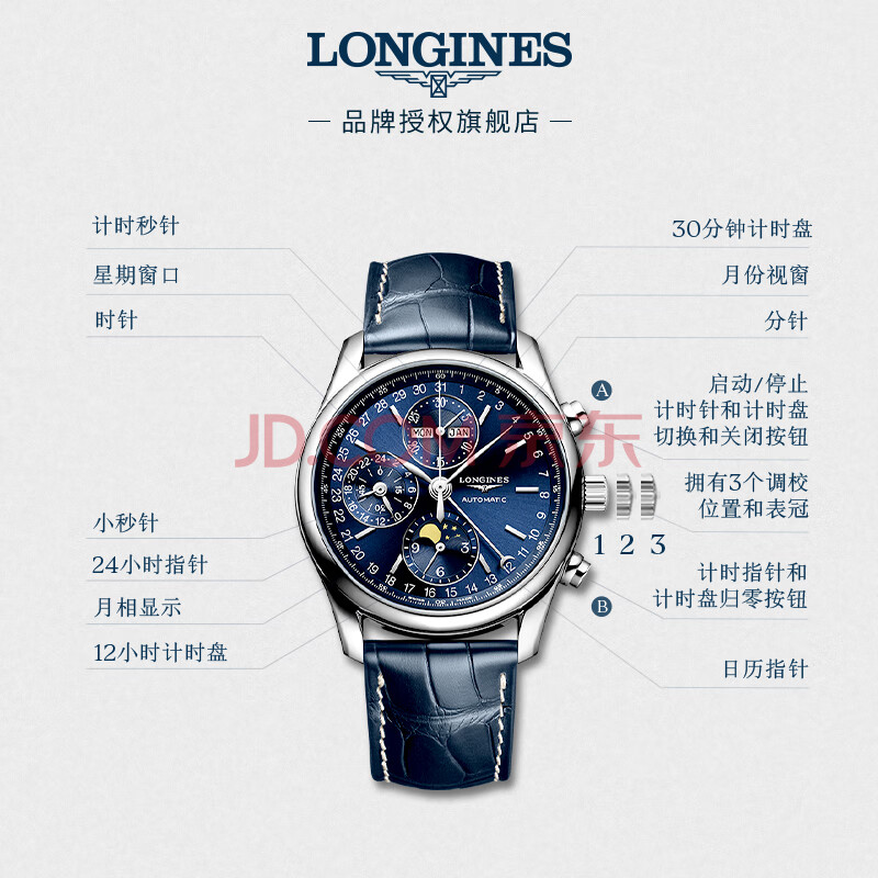 商品相册:浪琴(LONGINES)瑞士手表 名匠系列计时码表 月相男士皮带机械表 L26734920第