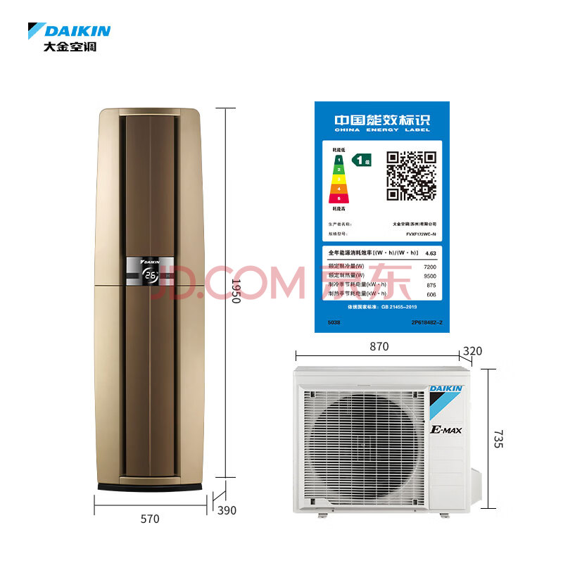 商品相册:大金(DAIKIN)空调 帕缔能 3匹1级能效 超强制热超远送风纯铜管变频冷暖柜机FVXF172WC-N金色第