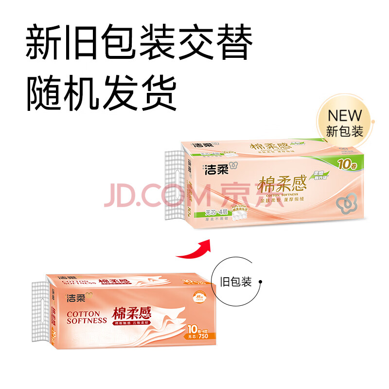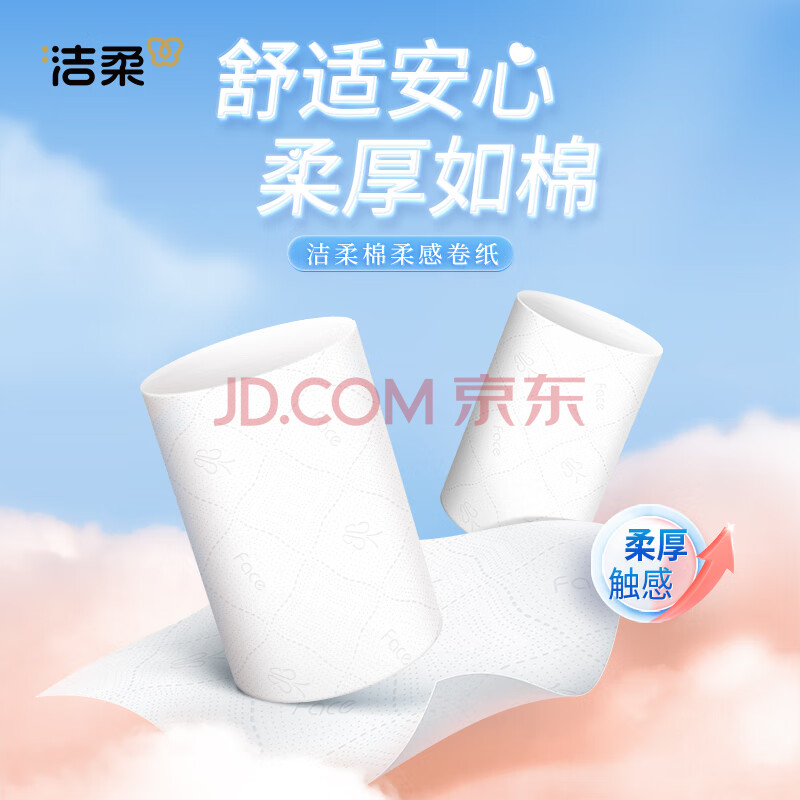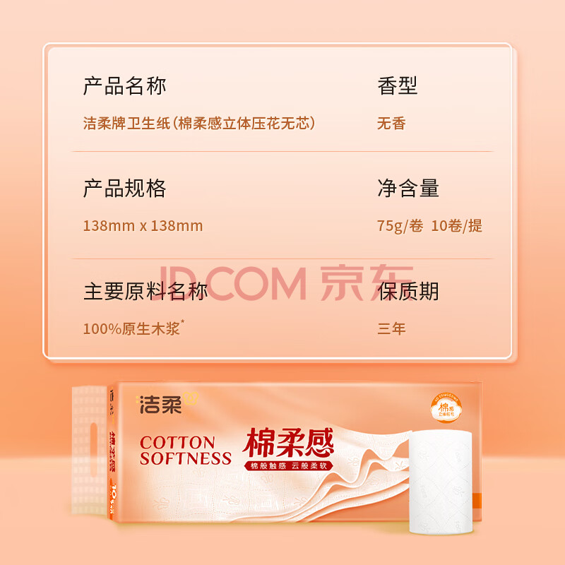 商品相册:洁柔无芯卷纸 棉柔感加厚4层75g*10卷 卫生纸 双面立体压花 柔厚如棉第