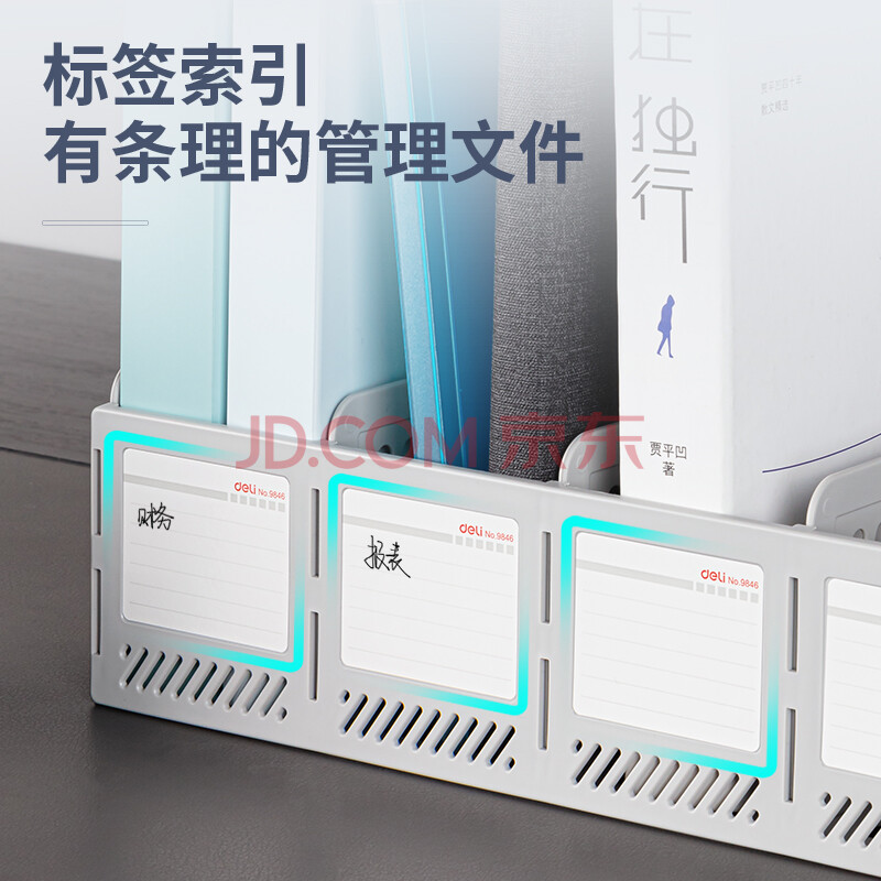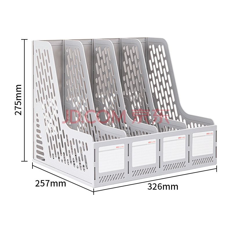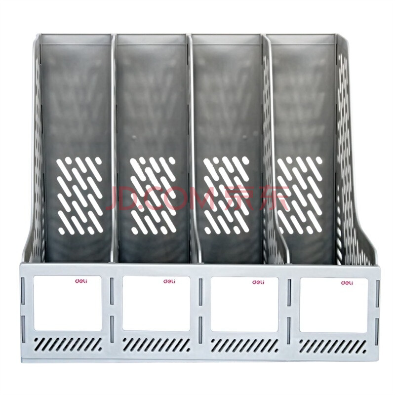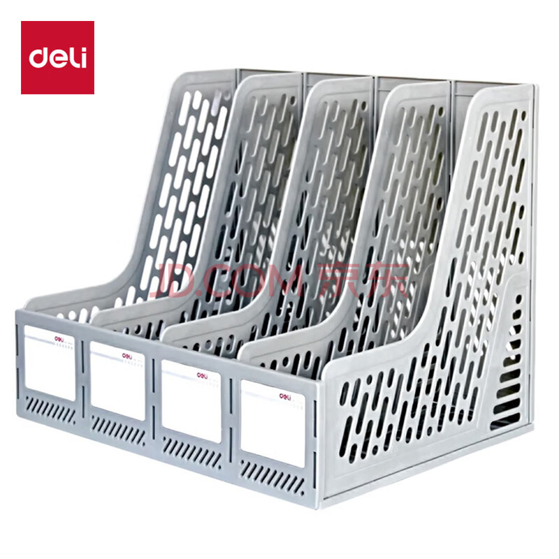 商品相册:得力(deli)四联镂空桌面文件框栏书立架档案收纳盒 办公室带标签资料文件置物架书本资料收纳神器 灰色9846第1张/共8