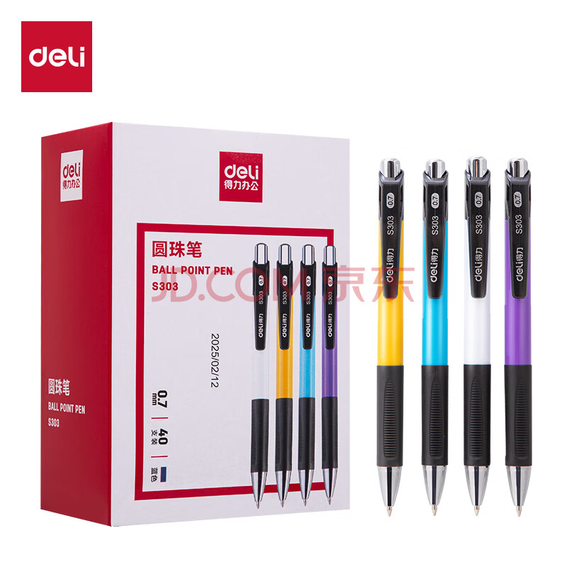 商品相册:得力(deli)圆珠笔中油笔 0.7mm子弹头按动笔原子笔 办公用品 蓝色 40支/盒 S303第1张/共7