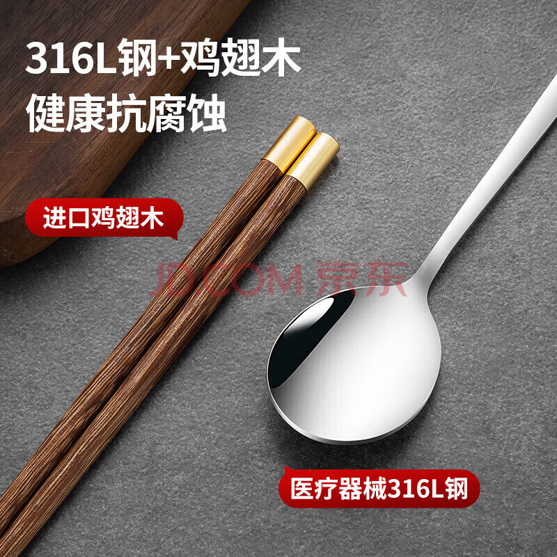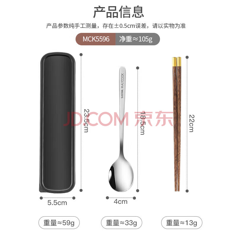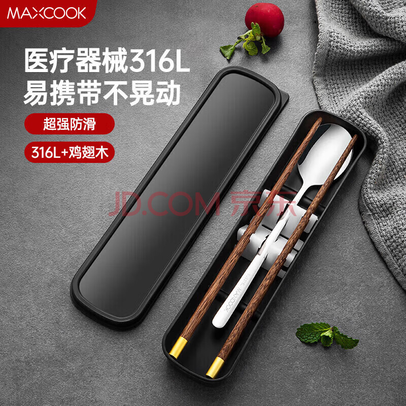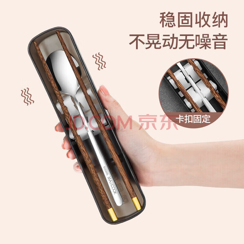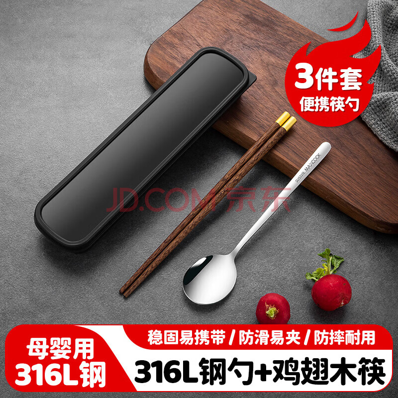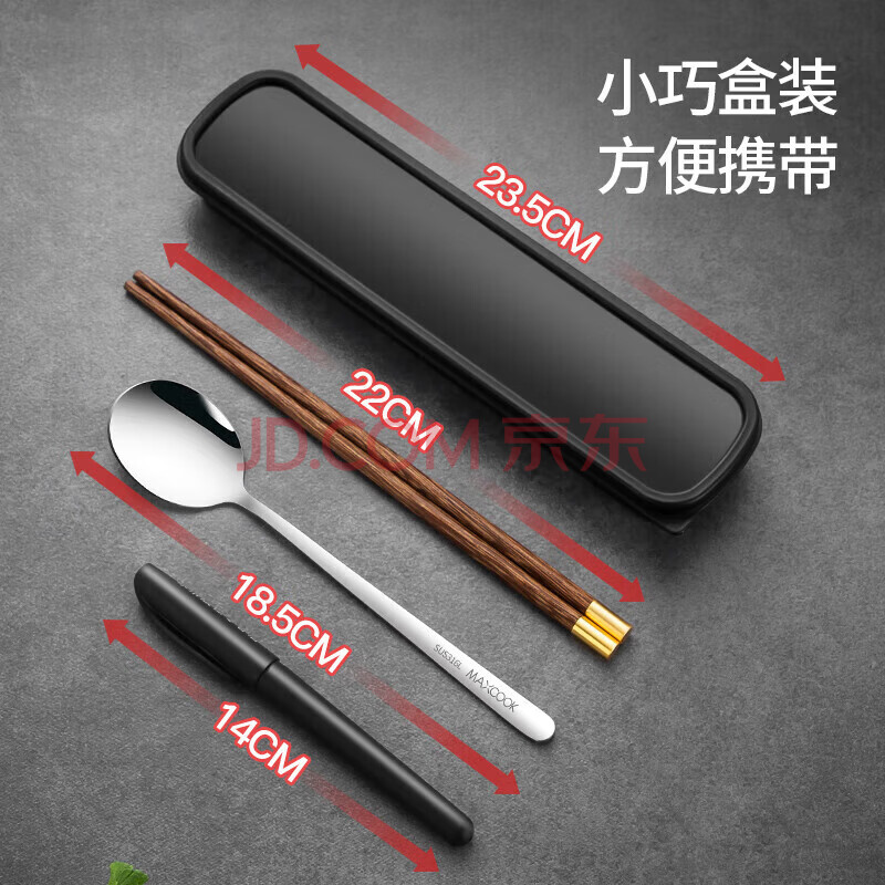 商品相册:美厨(MAXCOOK)316L不锈钢勺子木筷子餐具套装 鸡翅木便携式筷勺三件套MCK5596第