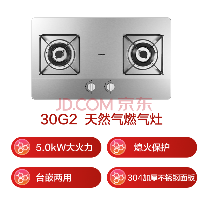 商品相册:老板(Robam)家用燃气灶天然气灶双灶嵌入式不锈钢燃气灶具5.0kW台嵌两用灶台防爆灶JZT-30G2第1张/共6