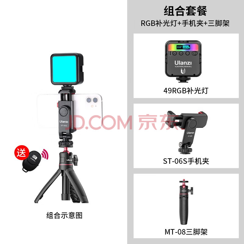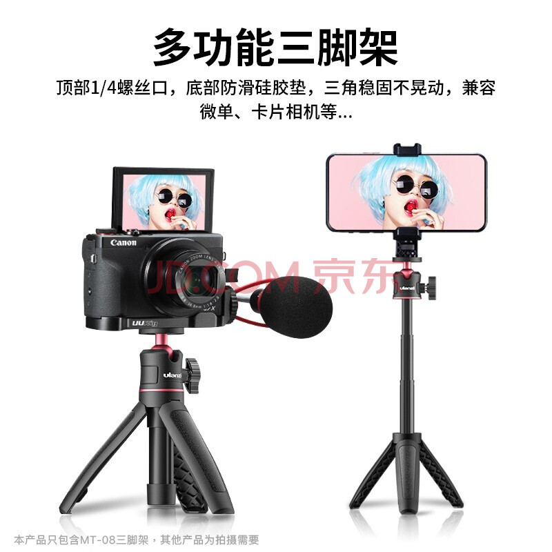 商品相册:ulanzi 优篮子MT-08三脚架手机夹补光套装(黑)迷你便携三脚架桌面手机直播支架vlog伸缩延长自拍杆第
